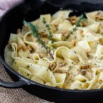 - Nudeln mit der Sauce vermengen und mit restlichen Maronen und Thymian toppen.