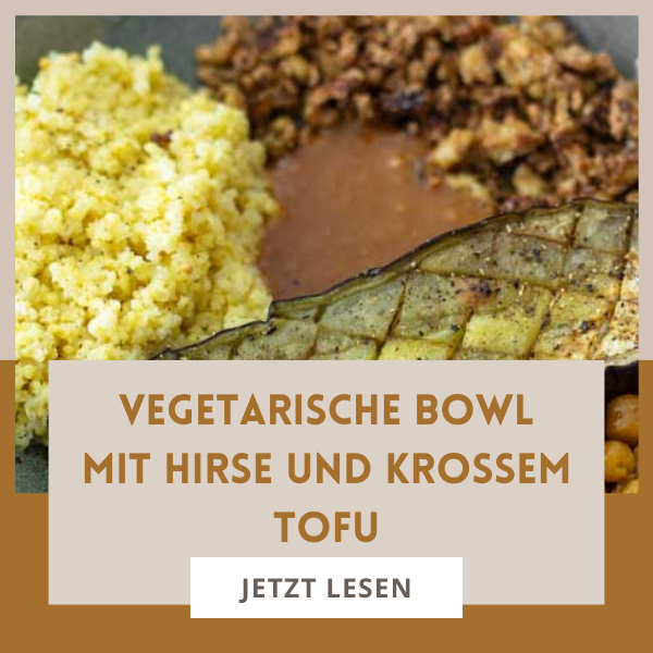 Enthält Werbung in Form von Partnerlinks Proteinreiches Bowl-Rezept mit Aubergine, Kichererbsen & Erdnusssauce (vegan möglich) Diese Hirse-Bowl mit krossem Tofu