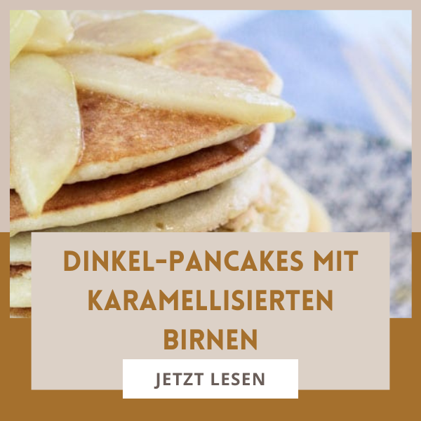 Diese Dinkel-Pancakes kommen ohne raffinierten Zucker aus. Die natürliche Süße entsteht durch Apfel-Birnenmark und karamellisierte Birnen – ideal für ein