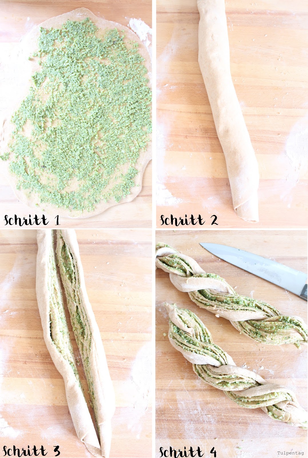 4. Windet die beiden Brotteile immer wieder umeinander – mit der Pesto-Seite nach oben.